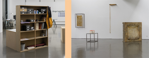 Links: Katharina Horlacher, - Arbeitsplatz, 2016, Regal gefüllt mit Brett, 2017Rechts: Rebekka Benzenberg, Sven Dirkamann - Latexabgüsse von Arbeiten von Lee Thomas Taylor, James Lee Byars, Karl Hartung, Michael Heizer, 2017